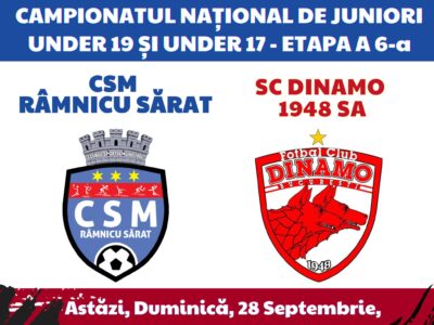 CAMPIONATUL NAȚIONAL DE JUNIORI, ⚽️ Etapa a 6-a, astăzi: 🚩 UNDER 19: CSM Râmnicu Sărat – Dinamo București 0️⃣-4️⃣ 🚩 UNDER 17:... Detalii...